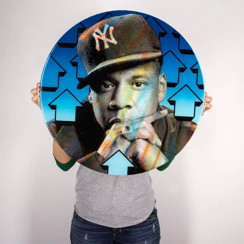 Type: Limited edition ORIGINAL art 1/1 mixed media on laser cut wood panel with industrial resin. A true collectors piece by NYC street artist, Above in honor of Jay Z. An exclusive piece from 1xRUN complete with COA